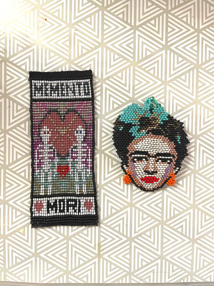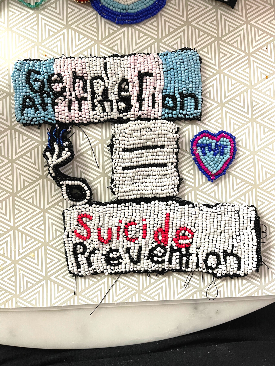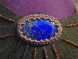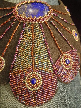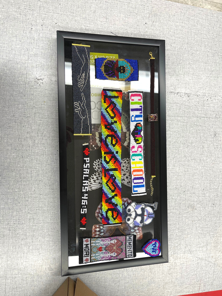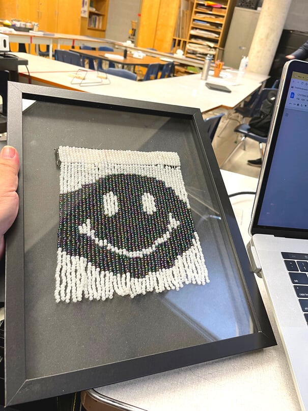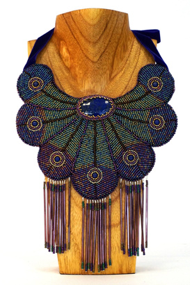 This student researched different beading methods and combined hand beading with looming to create a bespoke necklace based on historical art movements. They also created a stained glass lamp shade to match. Student researched how to sell work on consignment at local store.