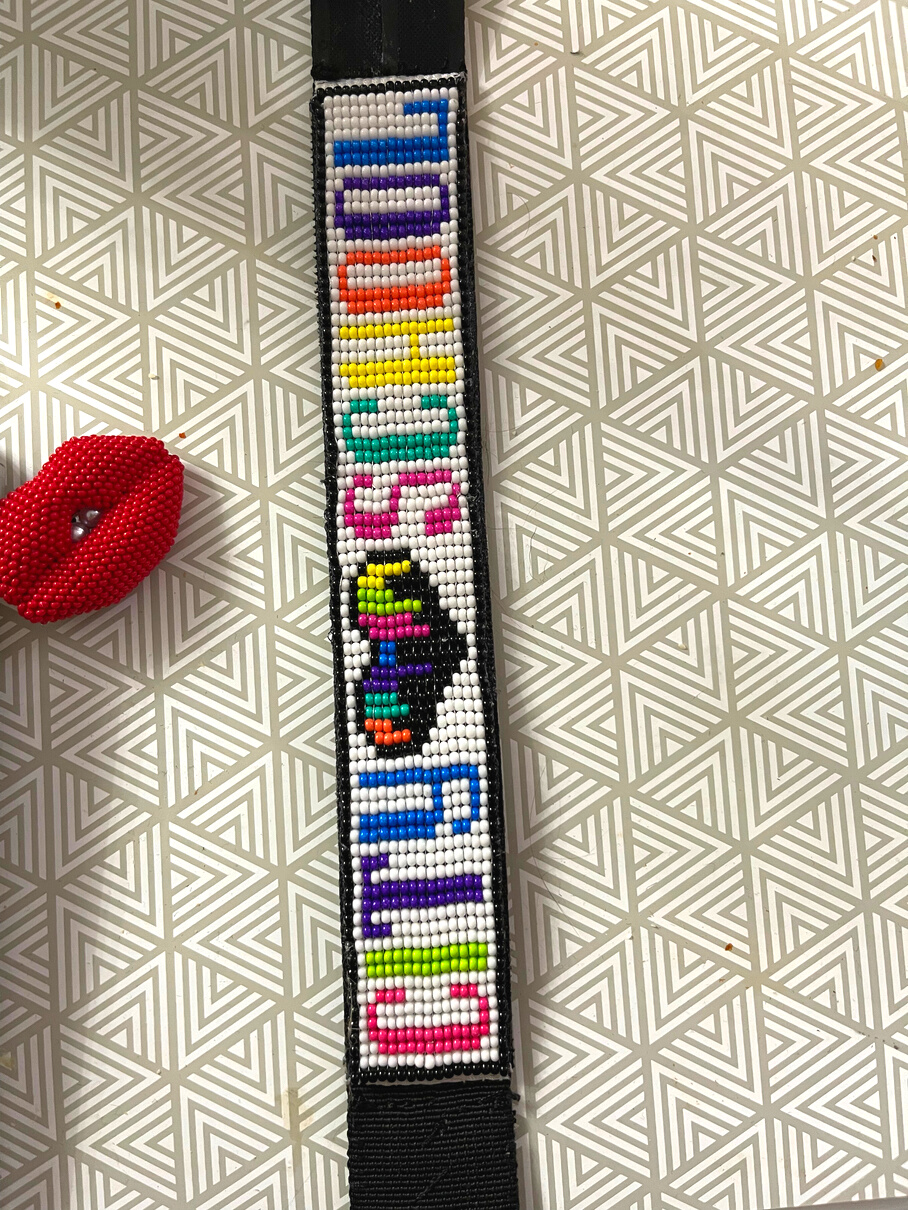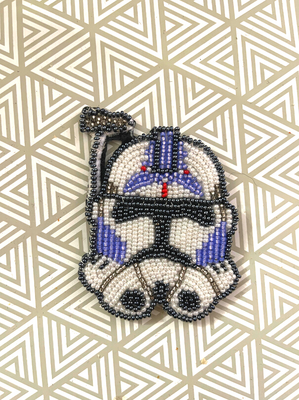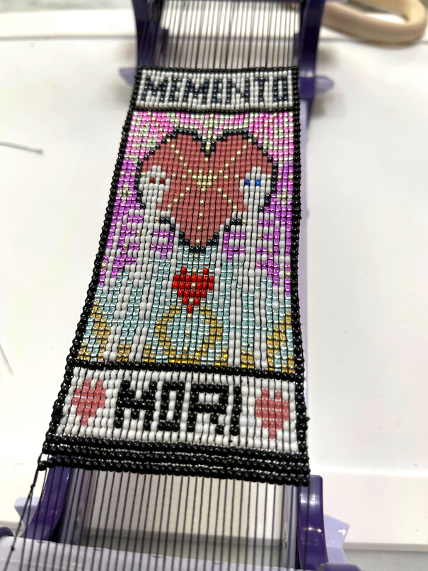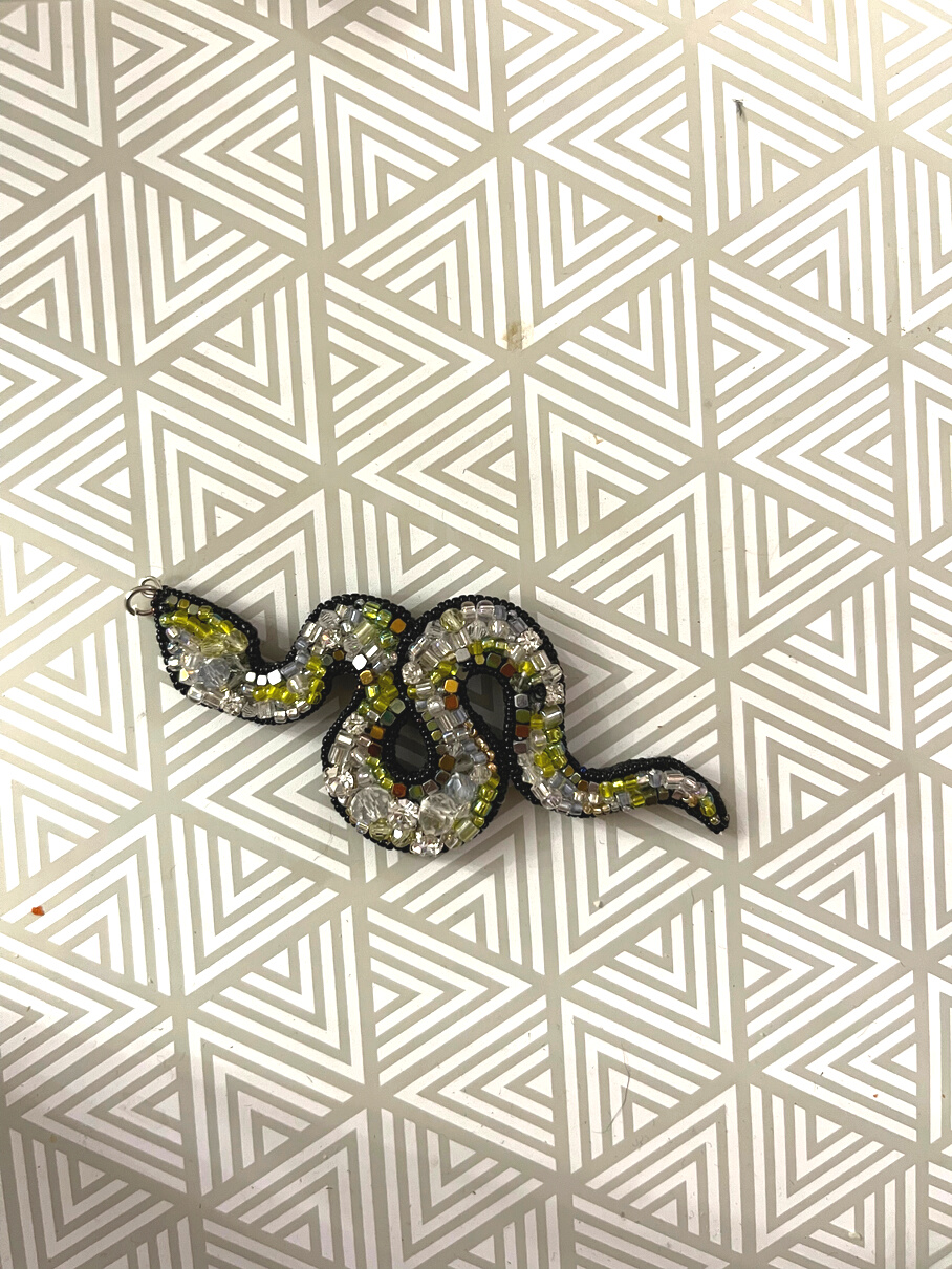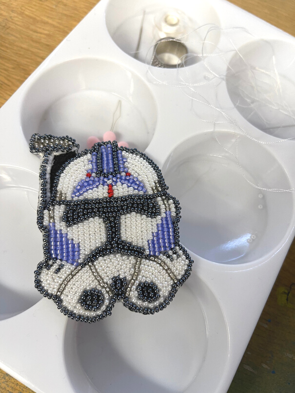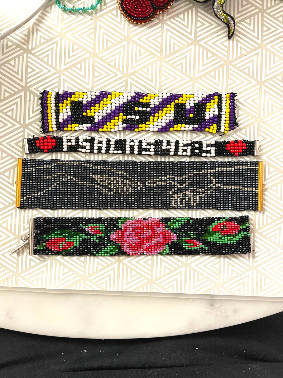 This student researched different beading methods and combined hand beading with looming to create a bespoke necklace based on historical art movements. They also created a stained glass lamp shade to match. Student researched how to sell work on consignment at local store.