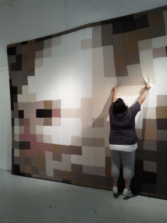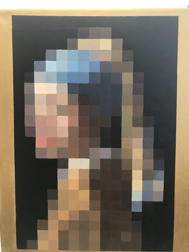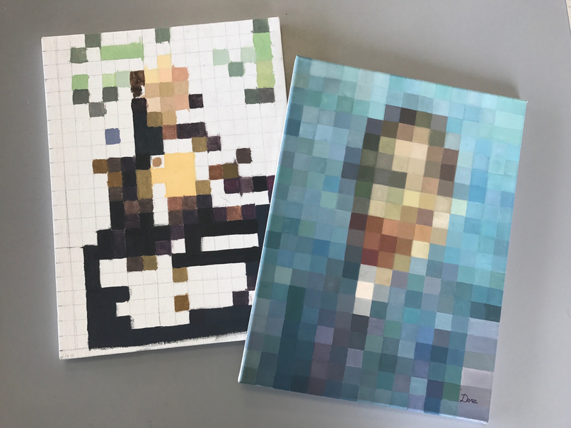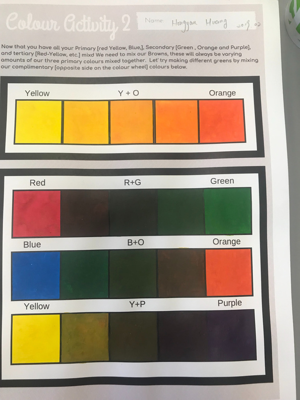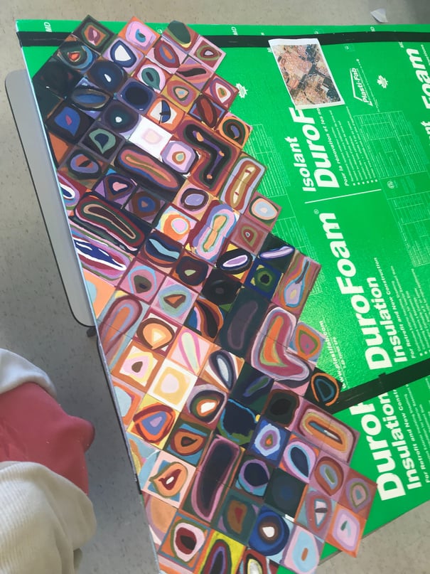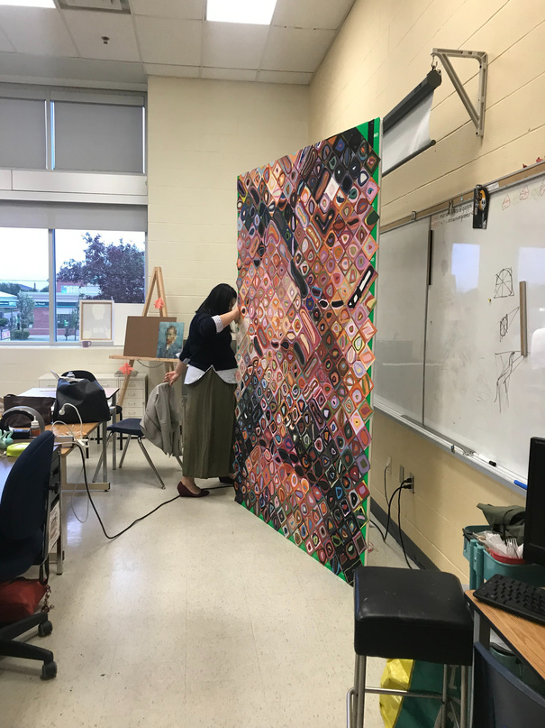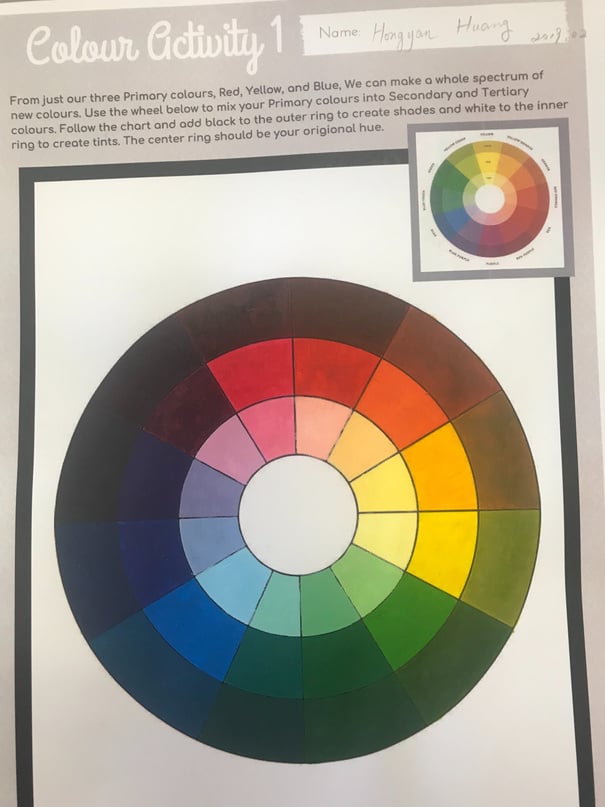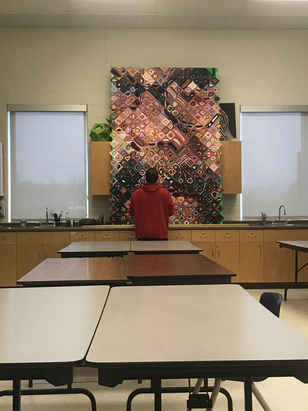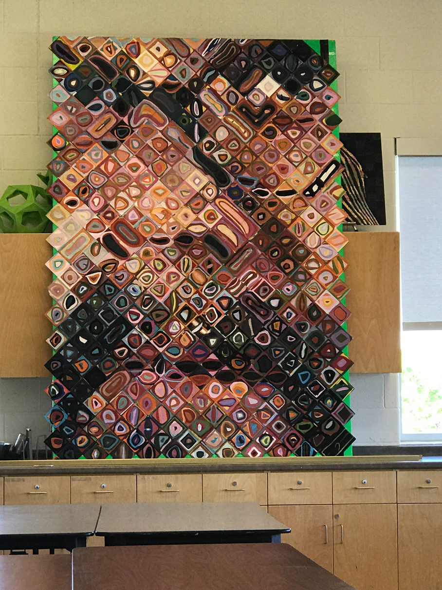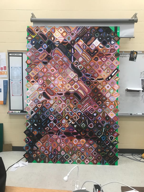 Students explore colour theory and mixing by creating a Close style image to hang in the stairwell of the school.