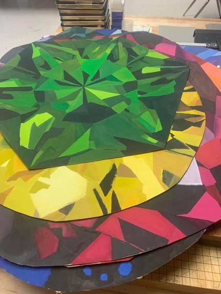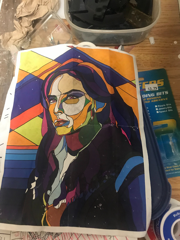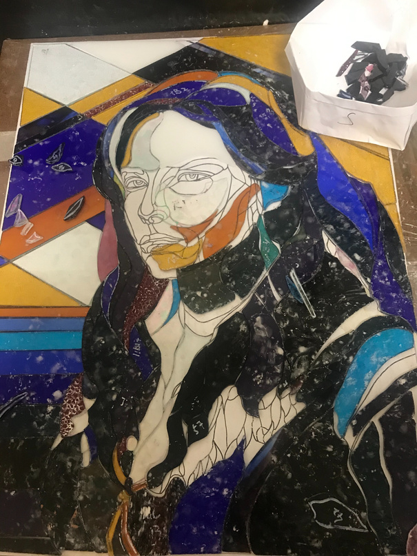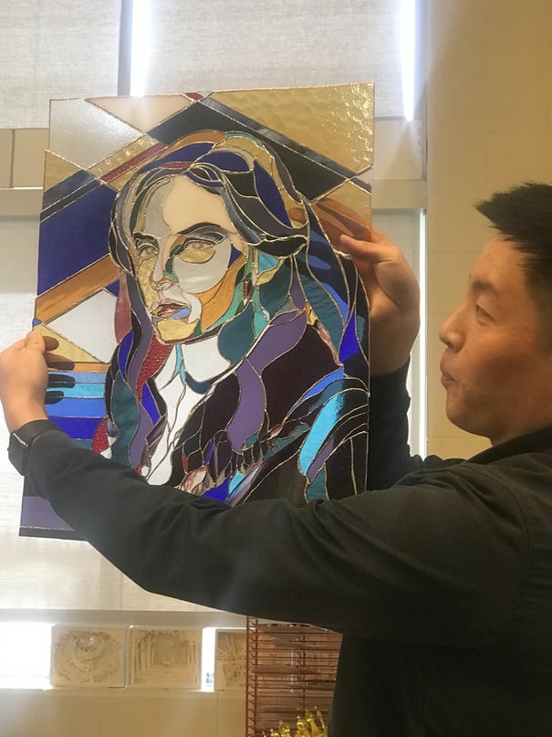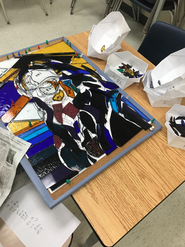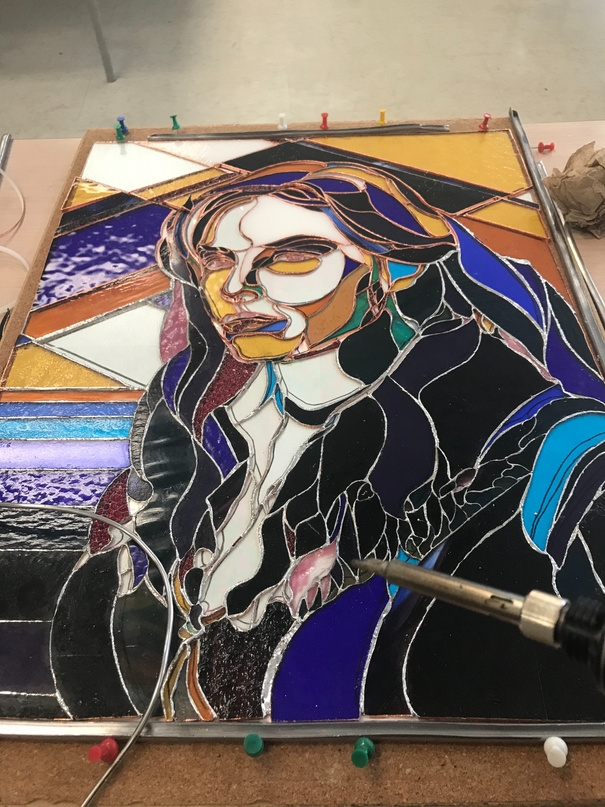 Student drew a faceted image of video game character and then created several color schemes on photoshop. They then matched favorite color scheme with glass available and proceeded to cut, snap, grind, and foil each piece of glass before soldering it. Student then created a website that he will populate with more work to invite custom commissions.