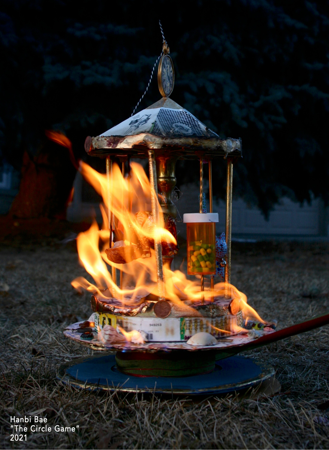 AWT4M: Student created a sculpture out of found objects and then performatively set it on fire to create a diptych.
