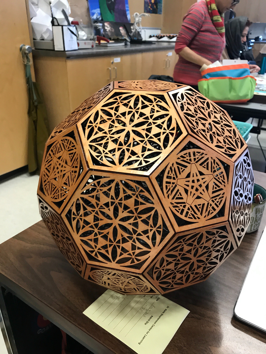 This student made a functioning lamp by created original pattern on adobe illustrator, tested on different materials, used a laser cutter to cut each piece, assembled and finished by hand, researched pricing and potential market and finally listed and sold item on Etsy Marketplace.